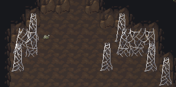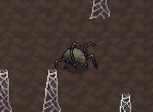 I knew I wanted the spider to live in an underground cave, so I started thinking about what I could use to populate the dungeon. The most obvious answer was cobwebs. The player can get entangled in them if not careful, reducing their movement speed, and alerting all spiders nearby. I mocked up a little sprite to test my idea in-game. The spiders can also have a skill to shoot these web at the player!