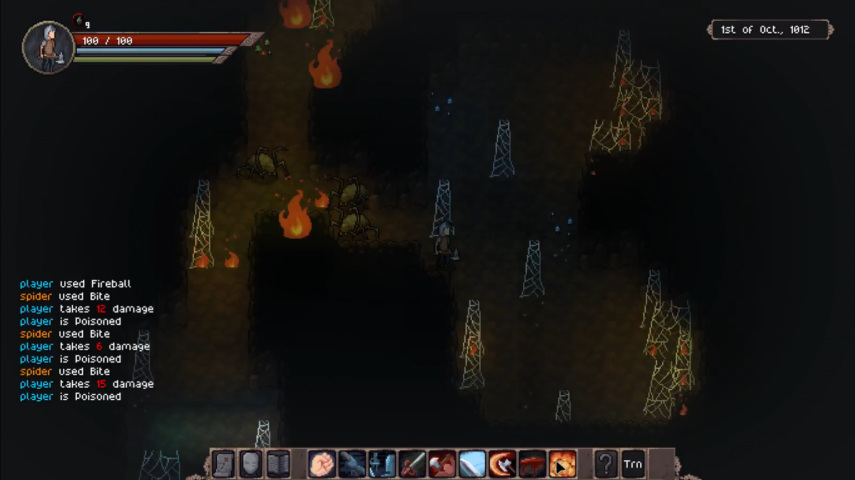 I have pretty much finished the new Spider species, revising the art, creating new sounds, and giving them a new ability, a little ball of web that restrains the target. "Restrained" is a new status effect that stops the actor from being able to move, and gives some penalties when attacking while restrained.