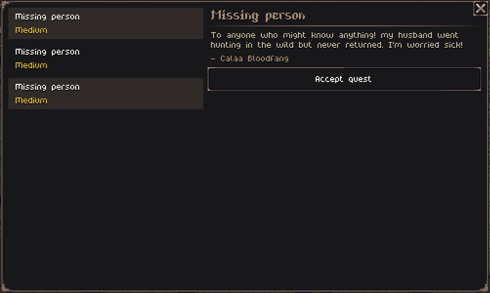 In this devlog, I continue working on the quest rework system, adding notice boards and revamping the UI for quests. If you want to know more about the quest overhaul, you can read about it in the previous devlog.