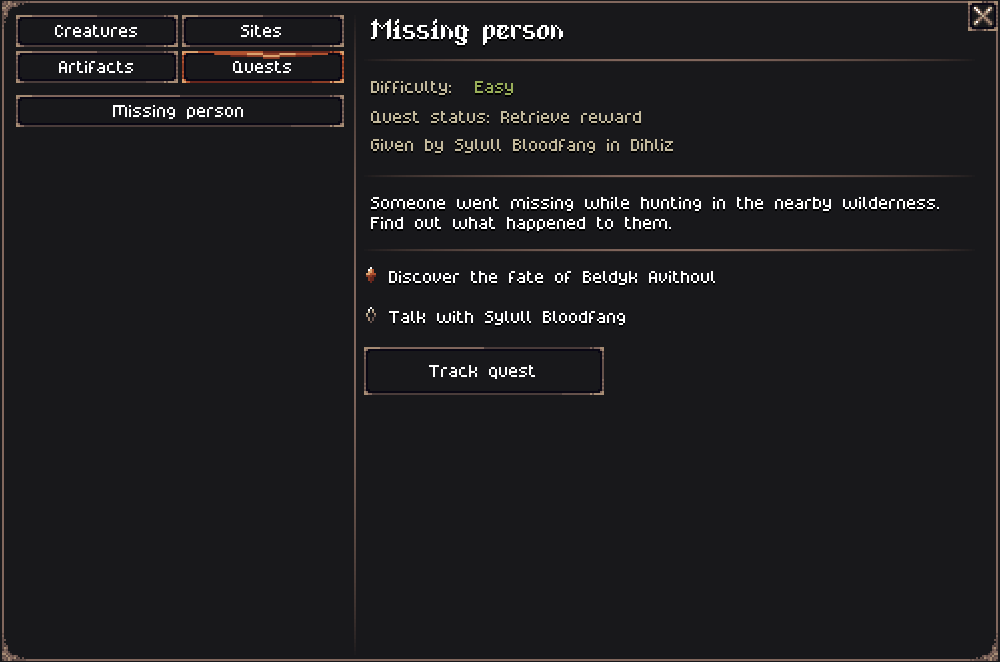 I've added several UI improvements to help with completing quests, all adapted to the new framework. This includes a revamp of the Codex page for quests, tracking of active quests, and quest markers on the map and in the chunk.